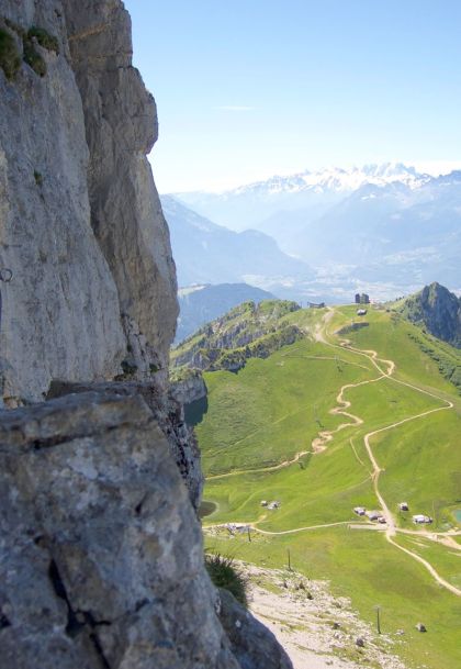 Perchée sur les hauteurs dominant Montreux, la via ferrata du Rocher de Naye offre une ascension spectaculaire entre parois vertigineuses et vues panoramiques sur le lac Léman, les Préalpes vaudoises et les sommets alpins. Classée K4 à K5 selon les sections (difficile à très difficile), elle s’adresse aux personnes en bonne forme physique ayant déjà une première expérience de la via ferrata. Le parcours, technique et aérien, alterne murs raides, traversées exposées et passages surplombants, dans un décor minéral impressionnant.